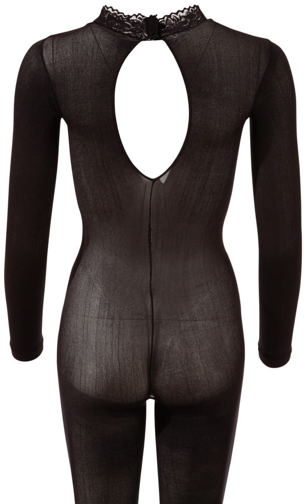Long-sleeved catsuit made of semi-transparent power net fabric. Crotchless and with a lace collar. With foot part. Soft and light. 100% polyamide.