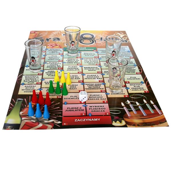 2 plansze do gry, kieliszki ze śmiesznymi nadrukami, 12 pionków i kostka