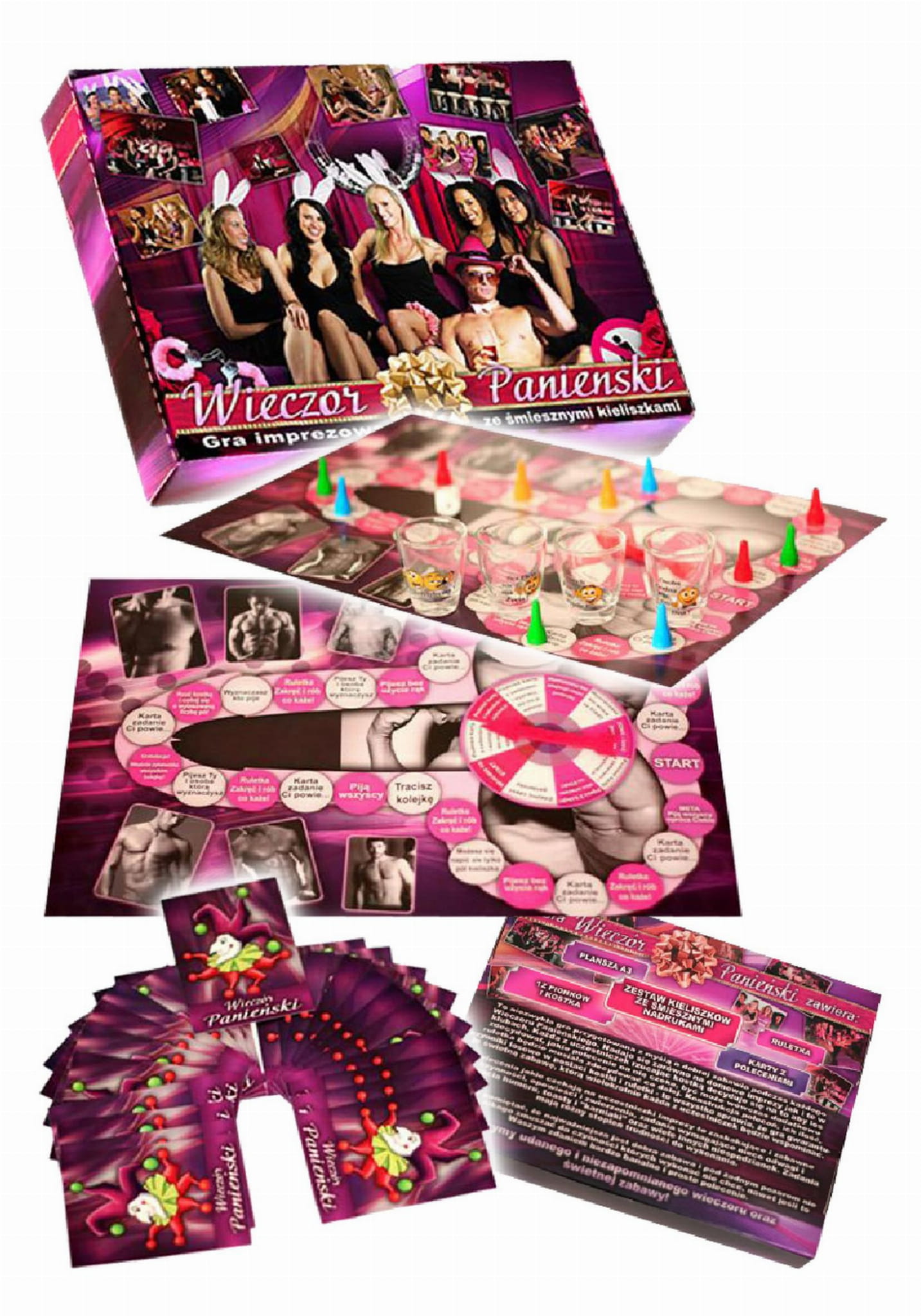 Gra planszowa z ruletką, kieliszkami ze śmiesznym nadrukiem, 12 pionkami, kostką i 24 kartami.