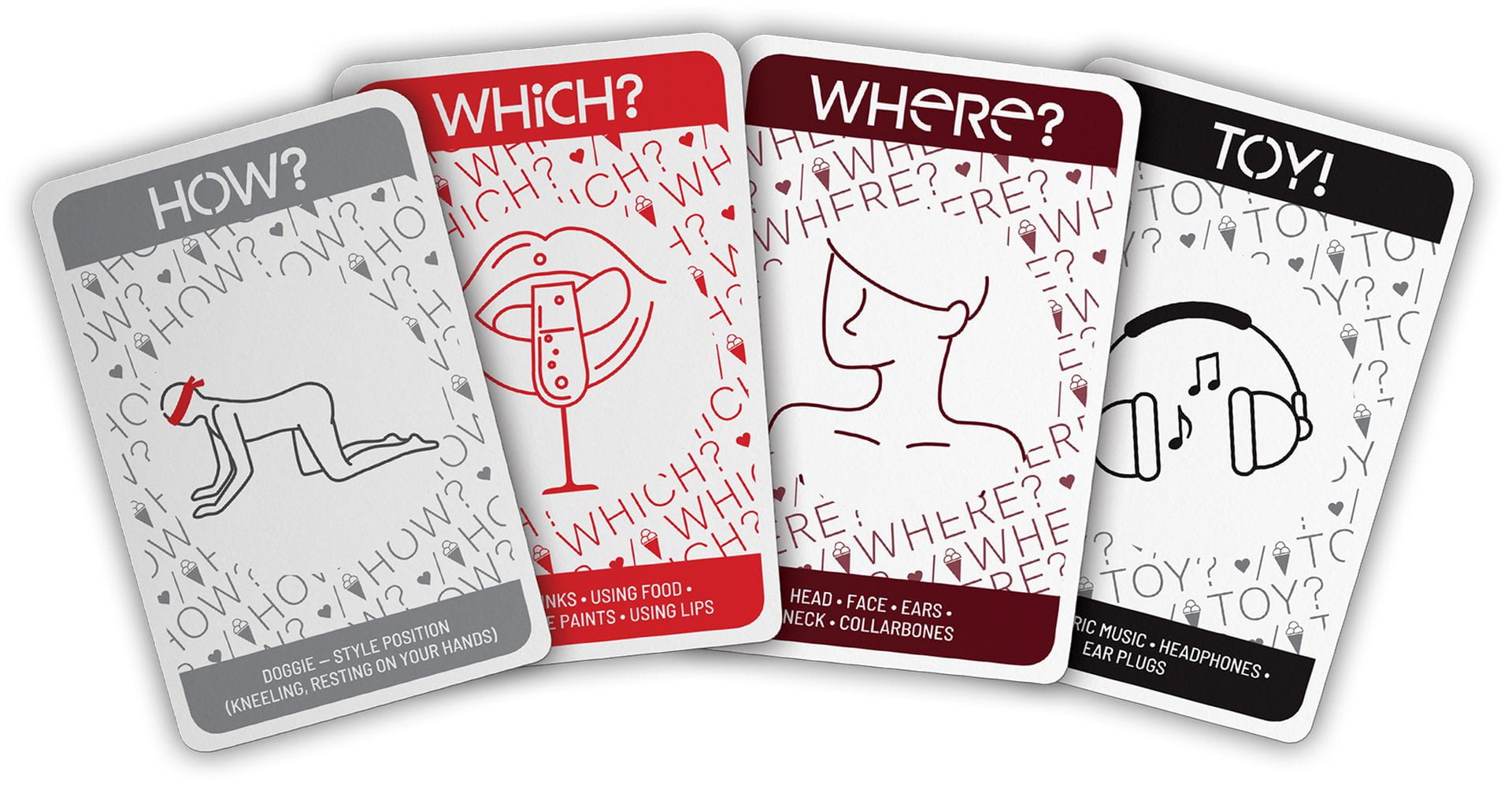 12 „JAK?” karty x 19 „CO?” karty x 10 „GDZIE?” karty x 14 „GADŻET!” karty = 31 920 scenariuszy miłosnych.