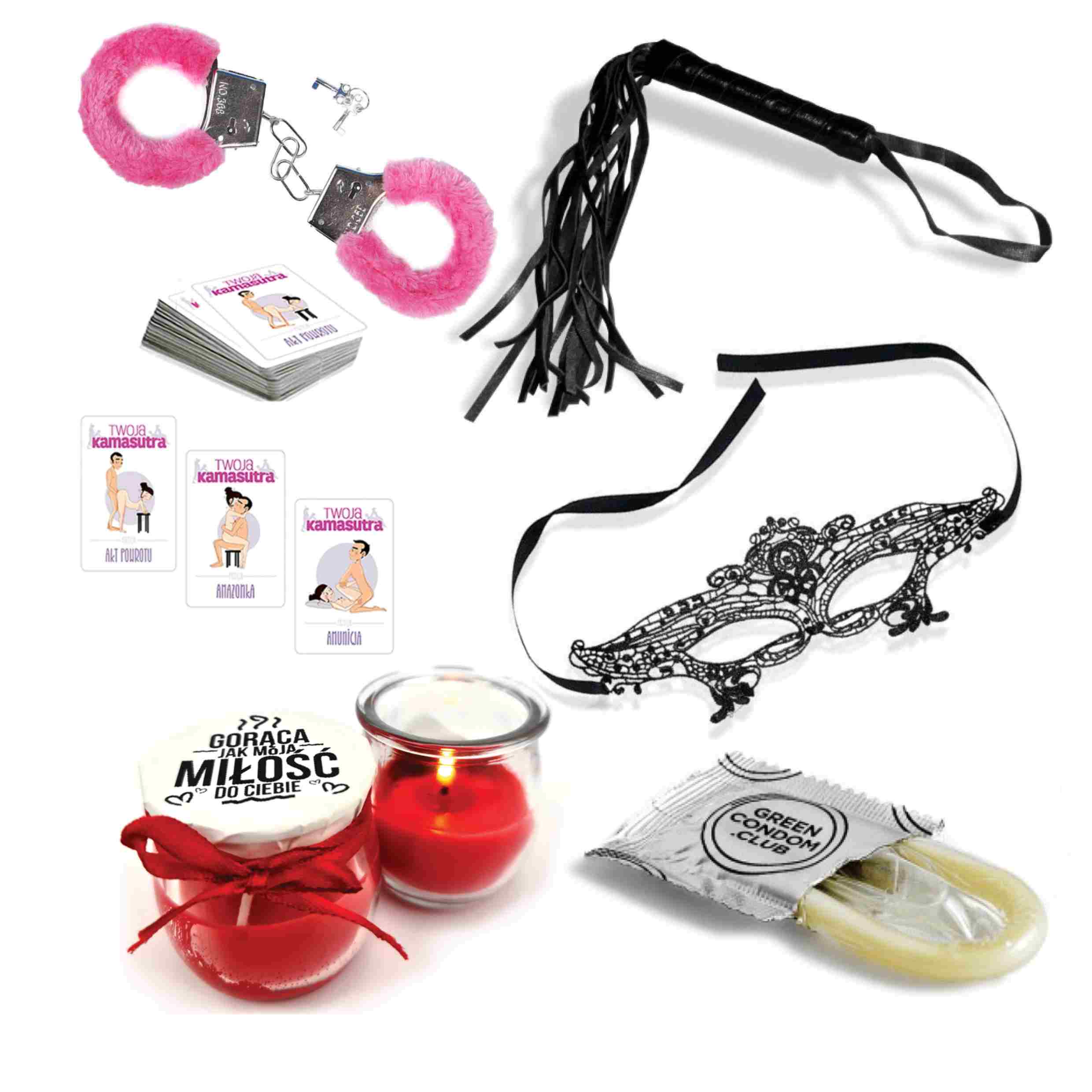 Zestaw zawiera: pejcz, komplet prezerwatyw, maskę koronkową, kajdanki z futerkiem, karty z pozycjami Kamasutry,