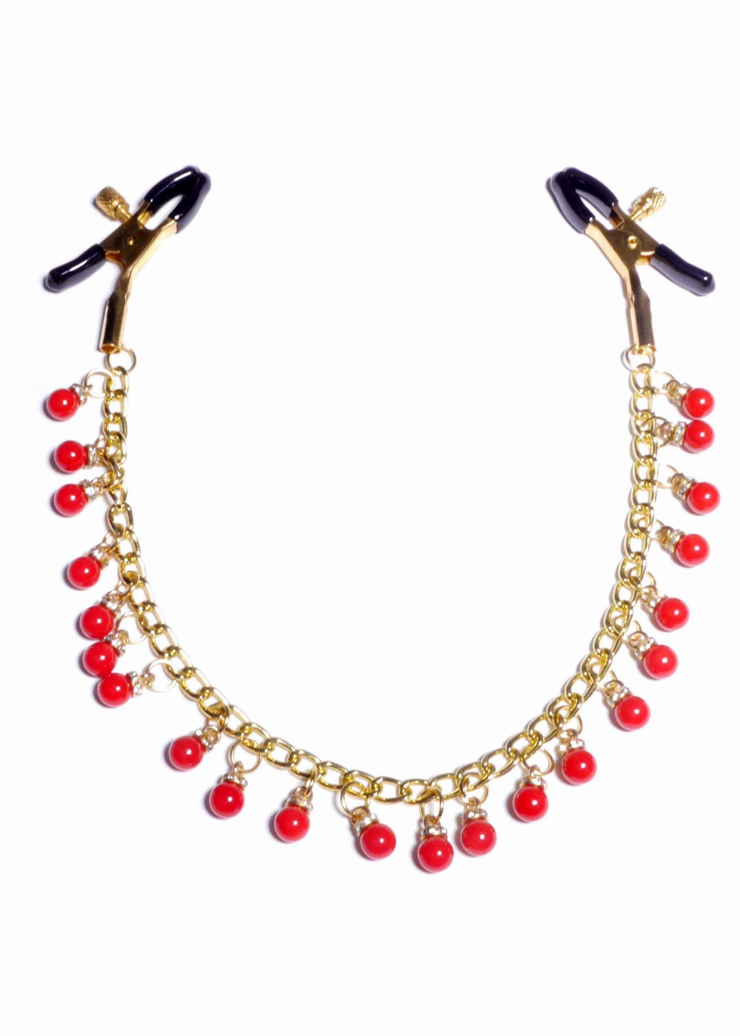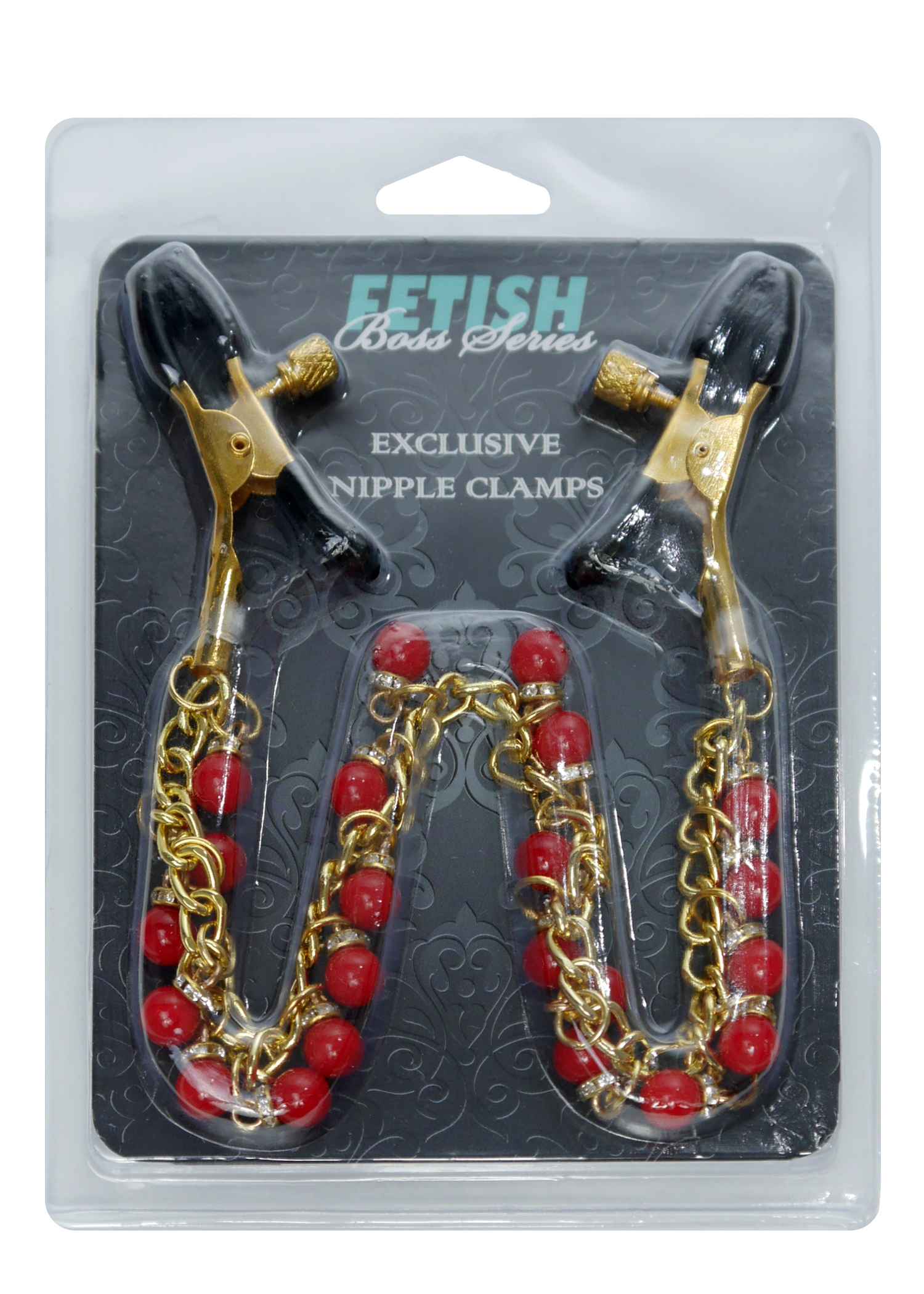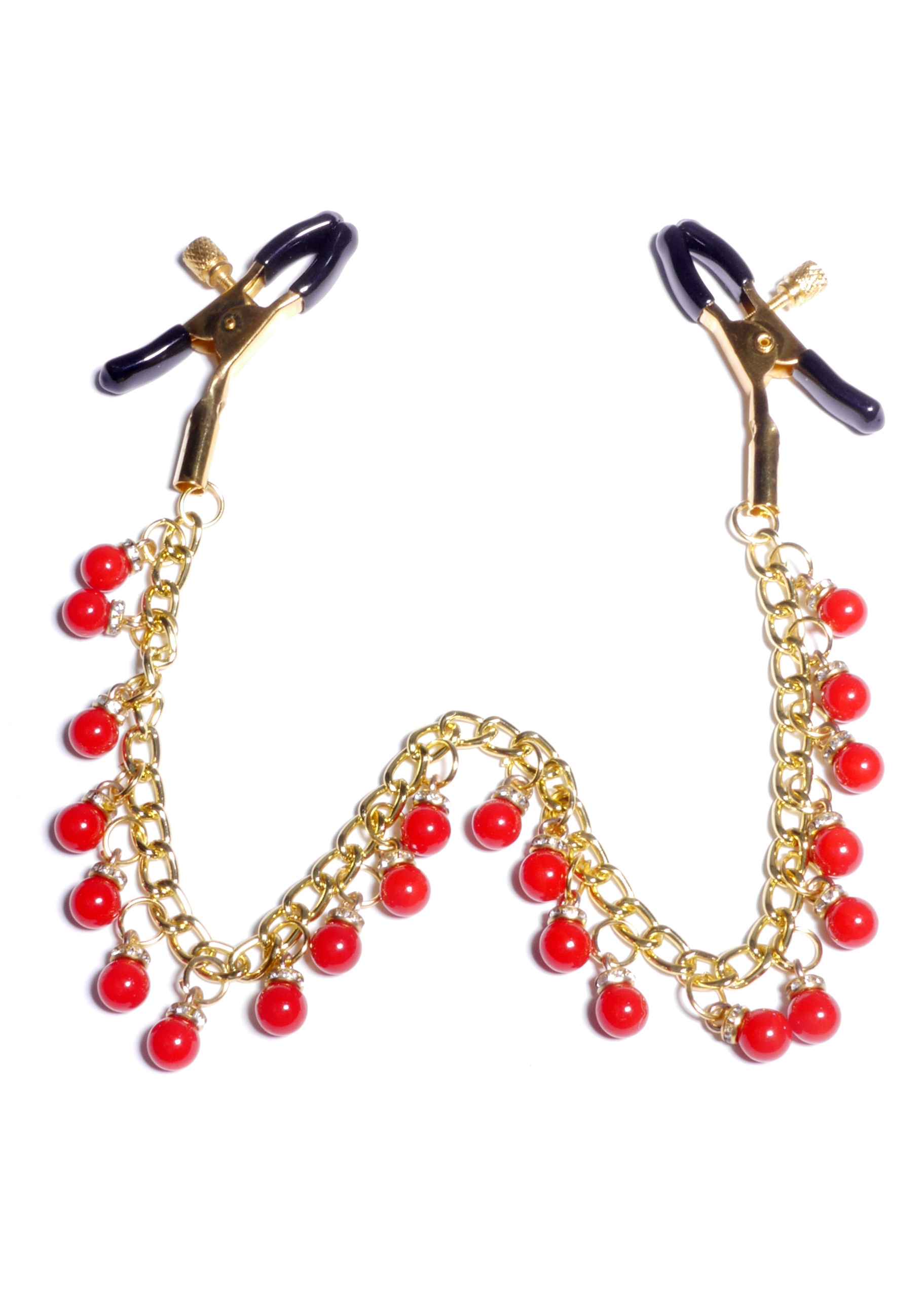 Wytrzymałe metalowe zaciski pokryte miękką gumą, te zaciski są idealne dla początkujących jak i entuzjastów. Siłę zacisku brodawki można regulować obracając śrubę, Elegancki łańcuszek z małymi zdobieniami łączy oba sutki, daje to niesamowitą stymulację przy każdym ruchu.
