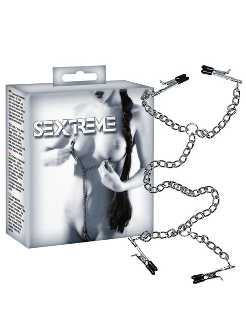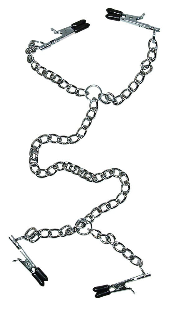 Dwa zaciski na sutki i łechtaczkę przymocowane do solidnego łańcucha. Metal w kolorze srebrnym, bez niklu.