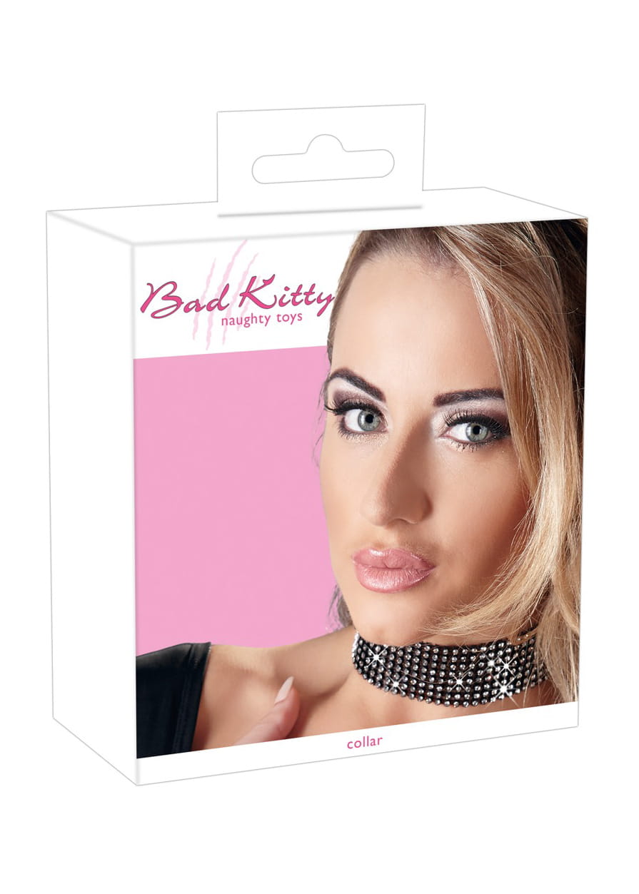 Czarna obroża, która ma szeroką przednią część, która jest pokryta kryształkami. Cieńszy pasek z tyłu posiada zatrzaski do mocowania i regulacji obroży (obwód 25 do 42 cm). Materiał: syntetyczny