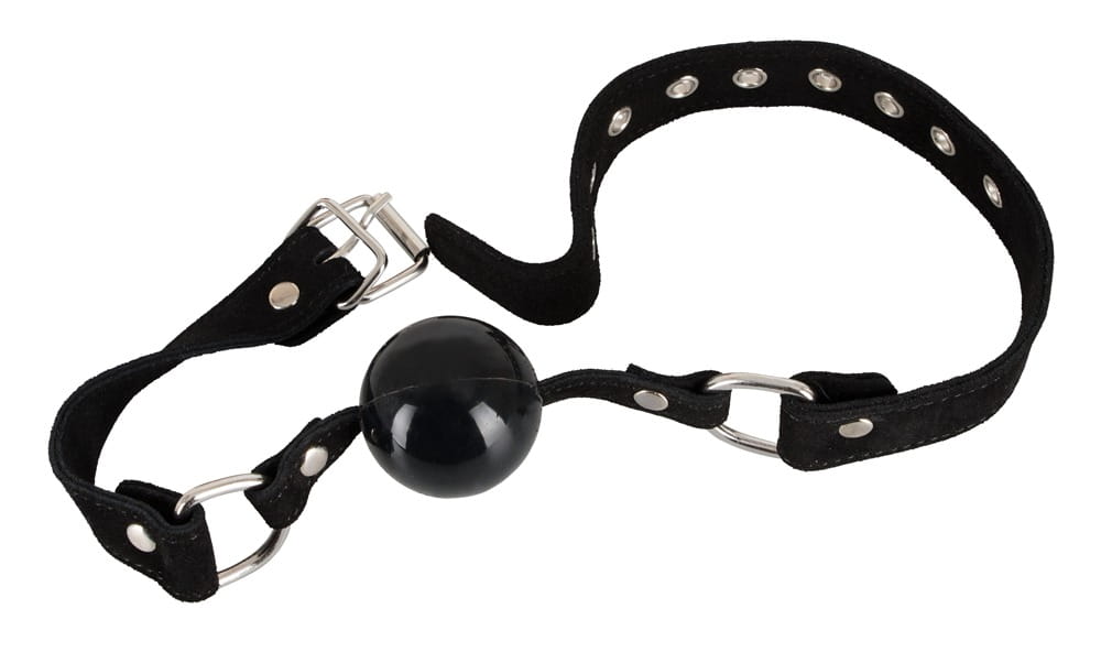 Czarny knebel wykonany z silikonu (średnica 4 cm) na regulowanych zamszowych paskach. Długość całkowita 65 cm.