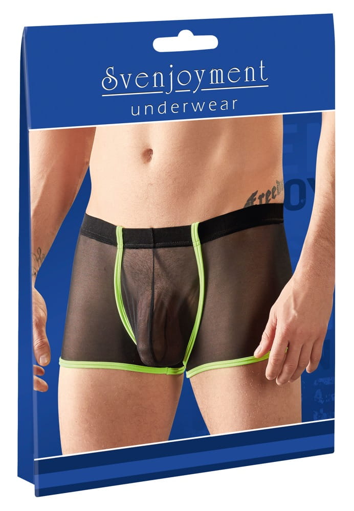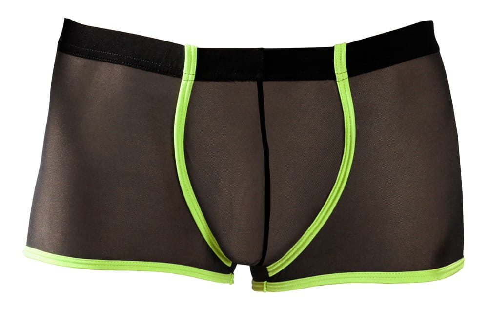 Tight-fitting, transparent pants with green neon stripes around the pouch and around the legs. Made out of soft and wonderfully stretchy powernet.