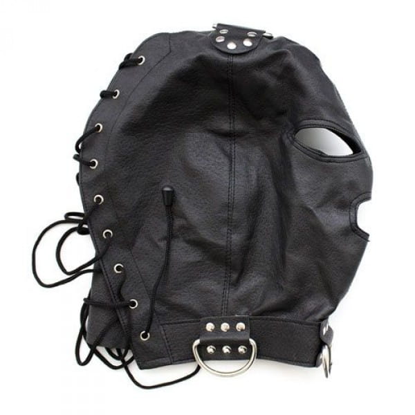 Czarna skórzana maska niewoli, z otworami na oczy i usta oraz kołnierzem z metalowymi pętelkami. Ta wytrzymała skórzana maska jest wykonana tak, aby przetrwać wiele pozostając miękką i wygodną. Jest to przedmiot Toyz4Lovers: aby spełnić twoje ukryte pragnienia!