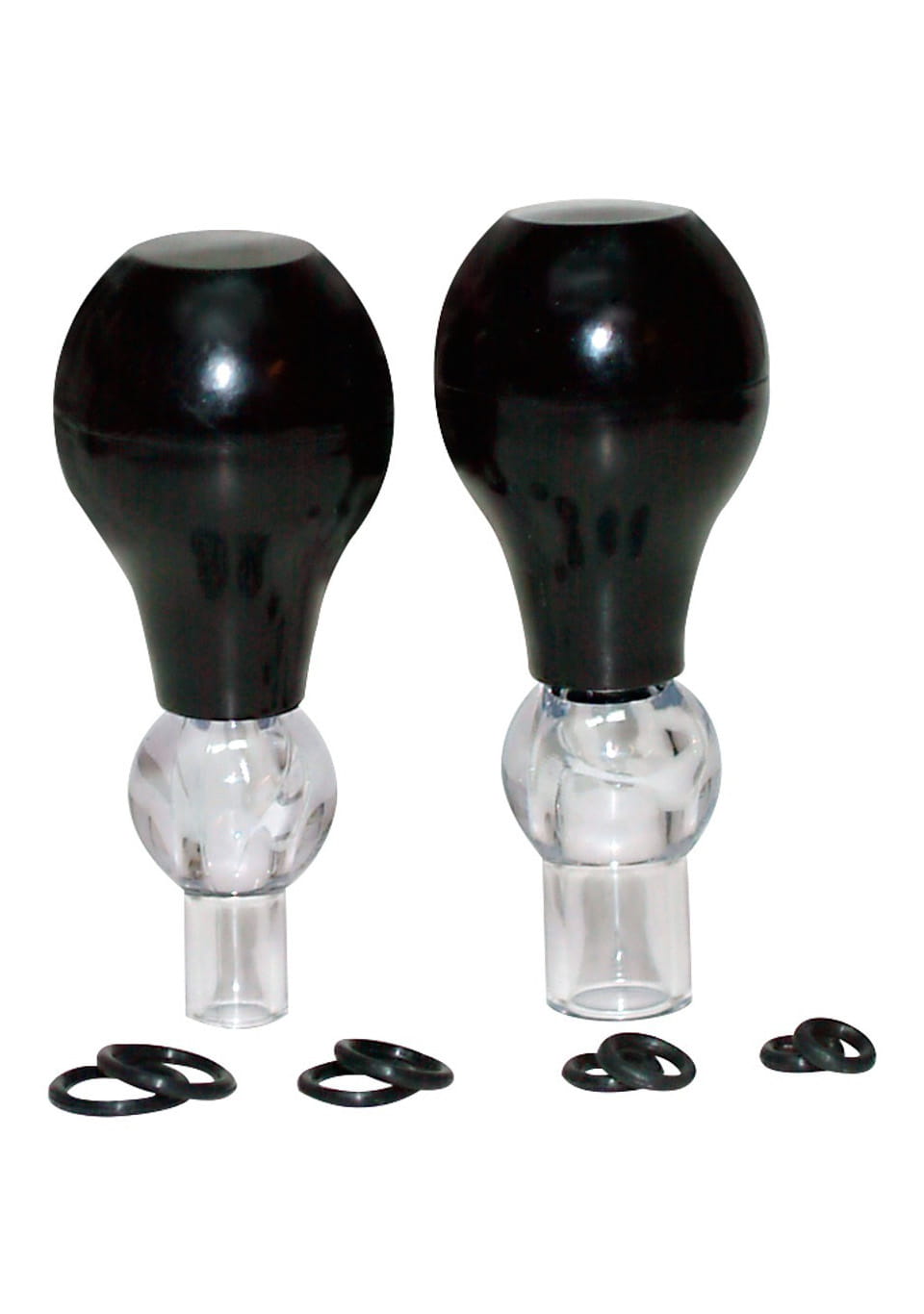 Two nipple pumps with 8 replacement rings. Just slip one of the rings over the pump´s opening and then place the opening onto your nipples. Then squeeze the pump ball. It will feel as if your partner is gently sucking them! The nipples become wonderfully erect, thanks to the vacuum and they also stay erect if you put the fixation rings around the nipples. Nipple pump with openings that have various diameters: 0.7 cm and 1.1 cm. Fixation rings in four different sizes: diameter 2 x 0.5 cm, 0.7 cm, 1 cm and 1.2 cm (slightly flexible). 10-piece set.
