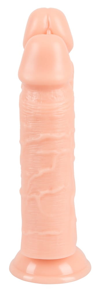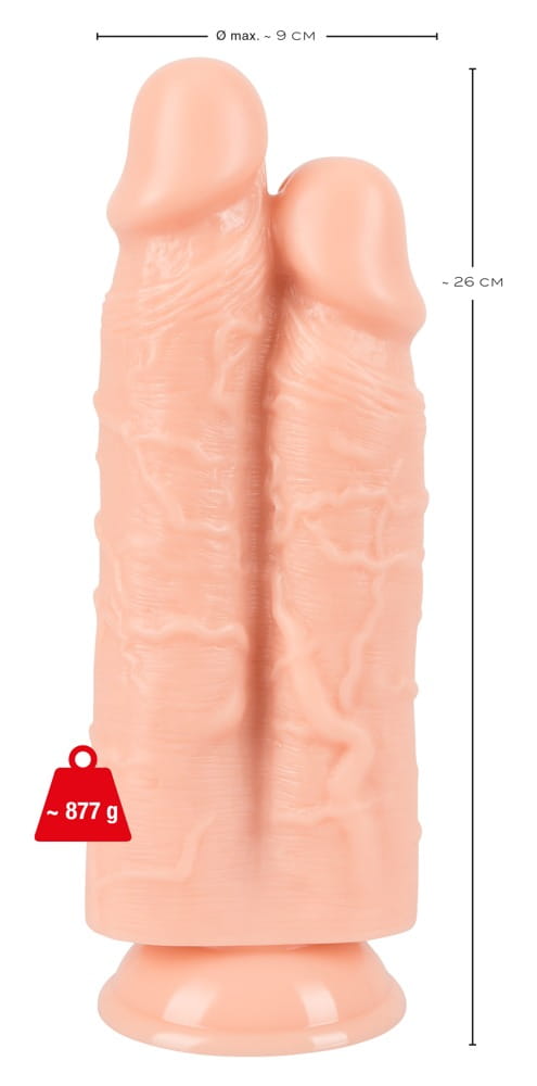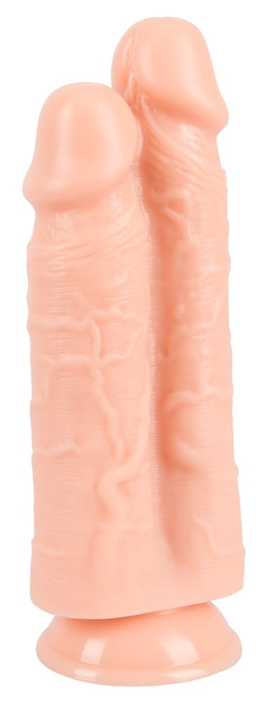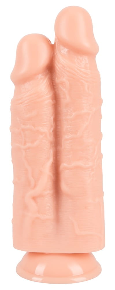 This double dildo really stands out with its length and girth. Two realistic penises with bulging glans and pronounced veins sit side by side on a strong suction cup. Perfect for advanced users who want to step up their stretching game.